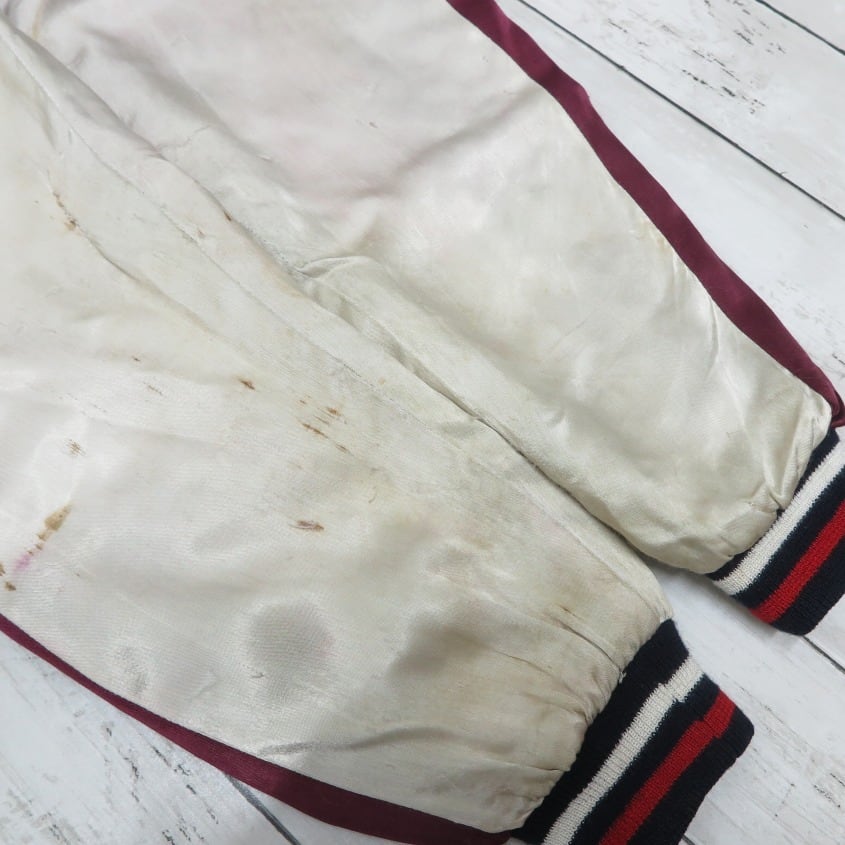50's~60's頃のビンテージスカジャンです。ジッパーはYKK回転式、A面は鷹の刺繍、B面には刺繍は入っておらずキルティング使用となります。B面にポケットはございません。刺繍に解れやA面の袖を中心に汚れがございますがデザインも良く、大変雰囲気の良いお品です。